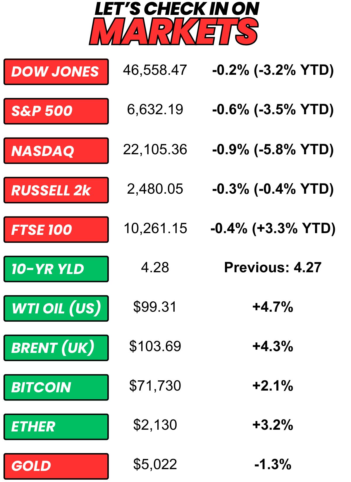 + Oil “settled higher on Friday, extending their weekly gains and holding above the key $100 a barrel level. Historic supply disruptions from the closure of the critical Strait of Hormuz due to the Iran war has sparked concerns of an inflationary shock.” (Investing.com)