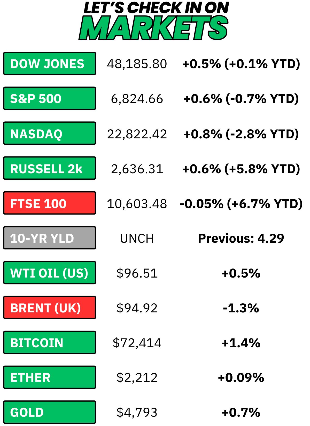 Either way, stonks went up again today. Iran is still big mad (read: no Strait for you) about Israel’s strike on Hezbollah in Lebanon on Wednesday. Tehran claims it violates the new ceasefire deal. But word is that Israel and Lebanon will begin negotiating directly to bury this most recent hatchet.