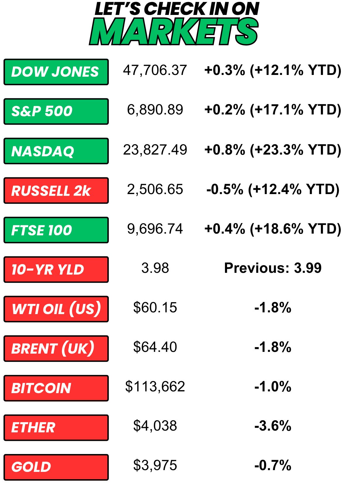 + US stocks “hit fresh records on Tuesday as investors stepped further into the artificial intelligence trade a day before the Federal Reserve is set to announce its interest rate decision.” (CNBC)
