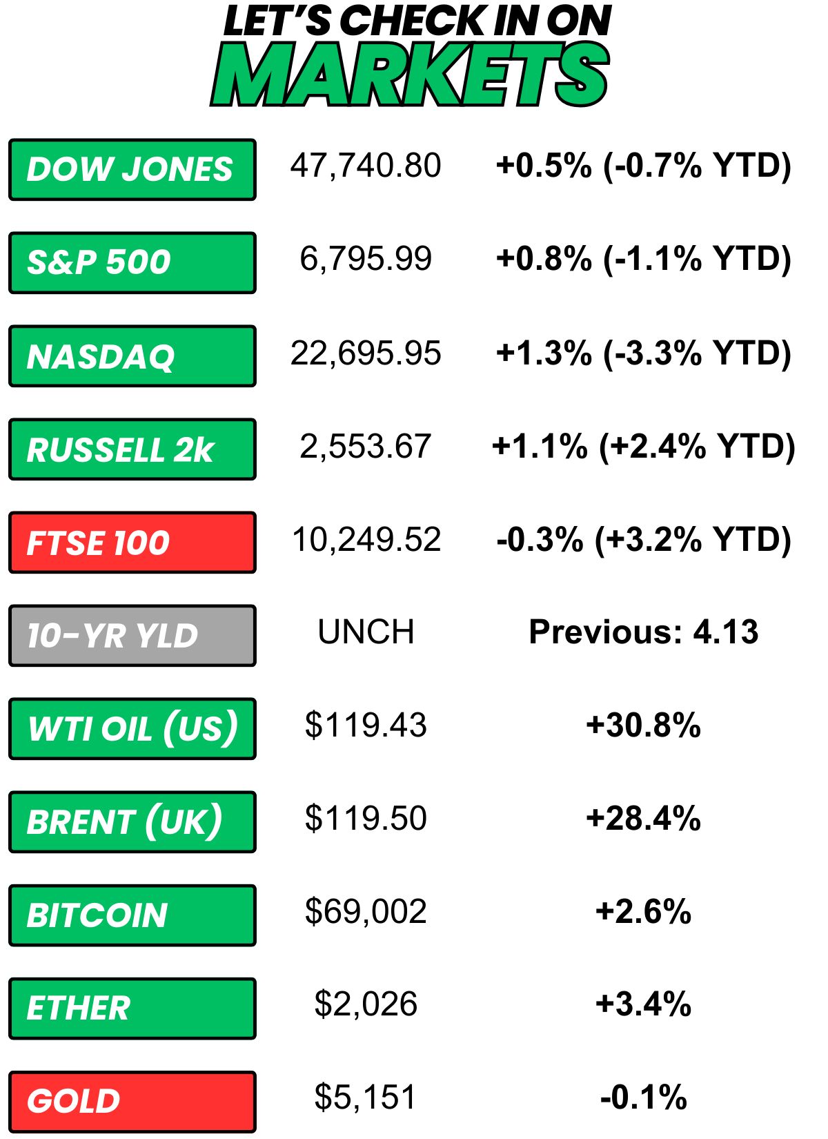 + US stocks “careened through a manic Monday, going from a steep early loss to a solid gain as worries turned into hope that the war with Iran may not last that long. Oil prices whipped from nearly $120 per barrel, their highest since 2022, back below $90.” (Yahoo! Finance)