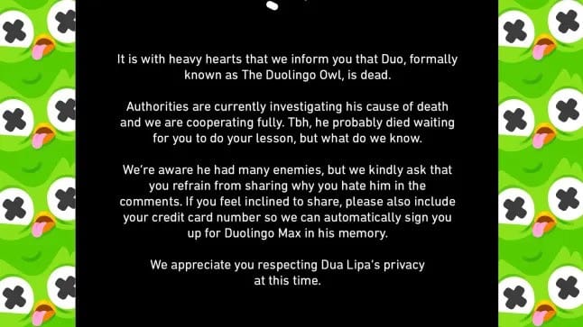 Last time Duolingo $DUOL ( ▲ 3.86% ) “killed off” its owl mascot, it was all a big marketing stunt. Yesterday, Duo was not so lucky.