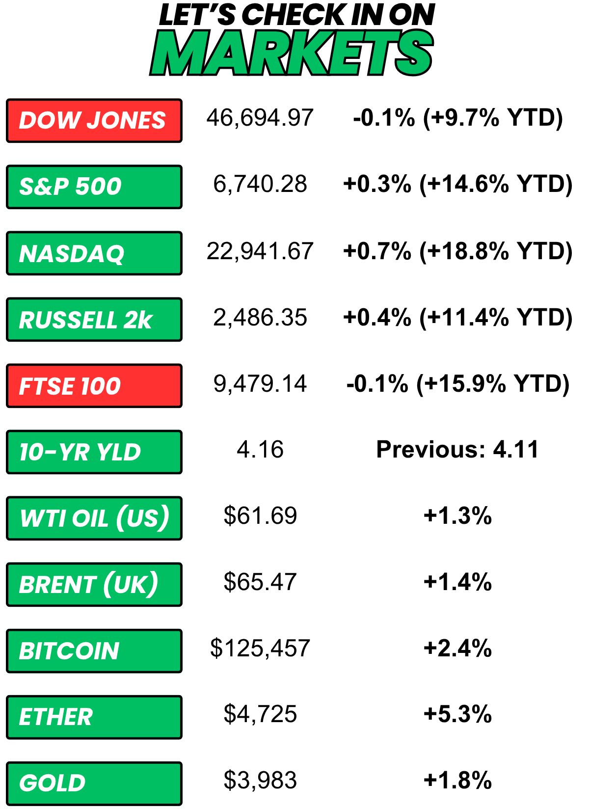 + US stocks “mostly gained on Monday as the federal government shutdown entered another week, while a megadeal between AMD and OpenAI lifted hopes for the AI trade.” (Yahoo! Finance)