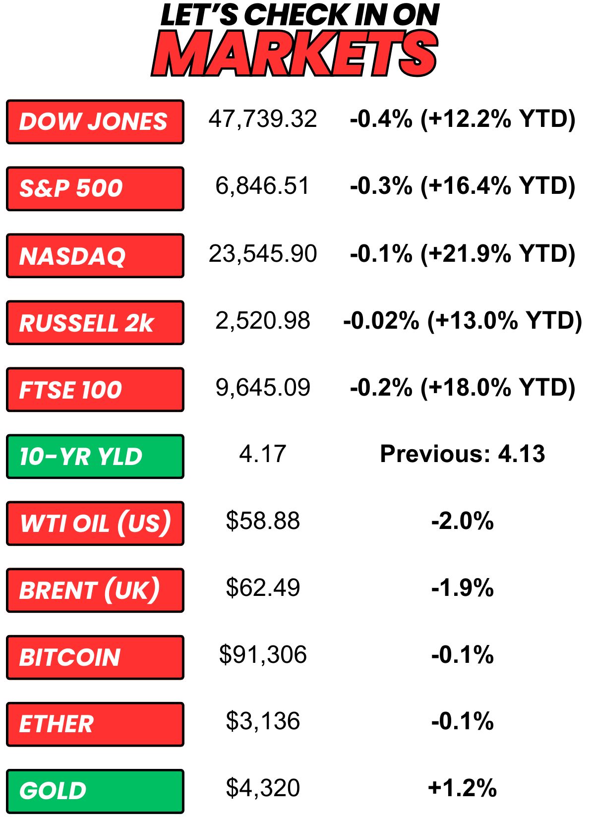 + The 10-year yield “climbed, with investors facing a series of auctions beginning Monday and a Fed rate decision Wednesday that may alter 2026 policy expectations.” (Yahoo! Finance)