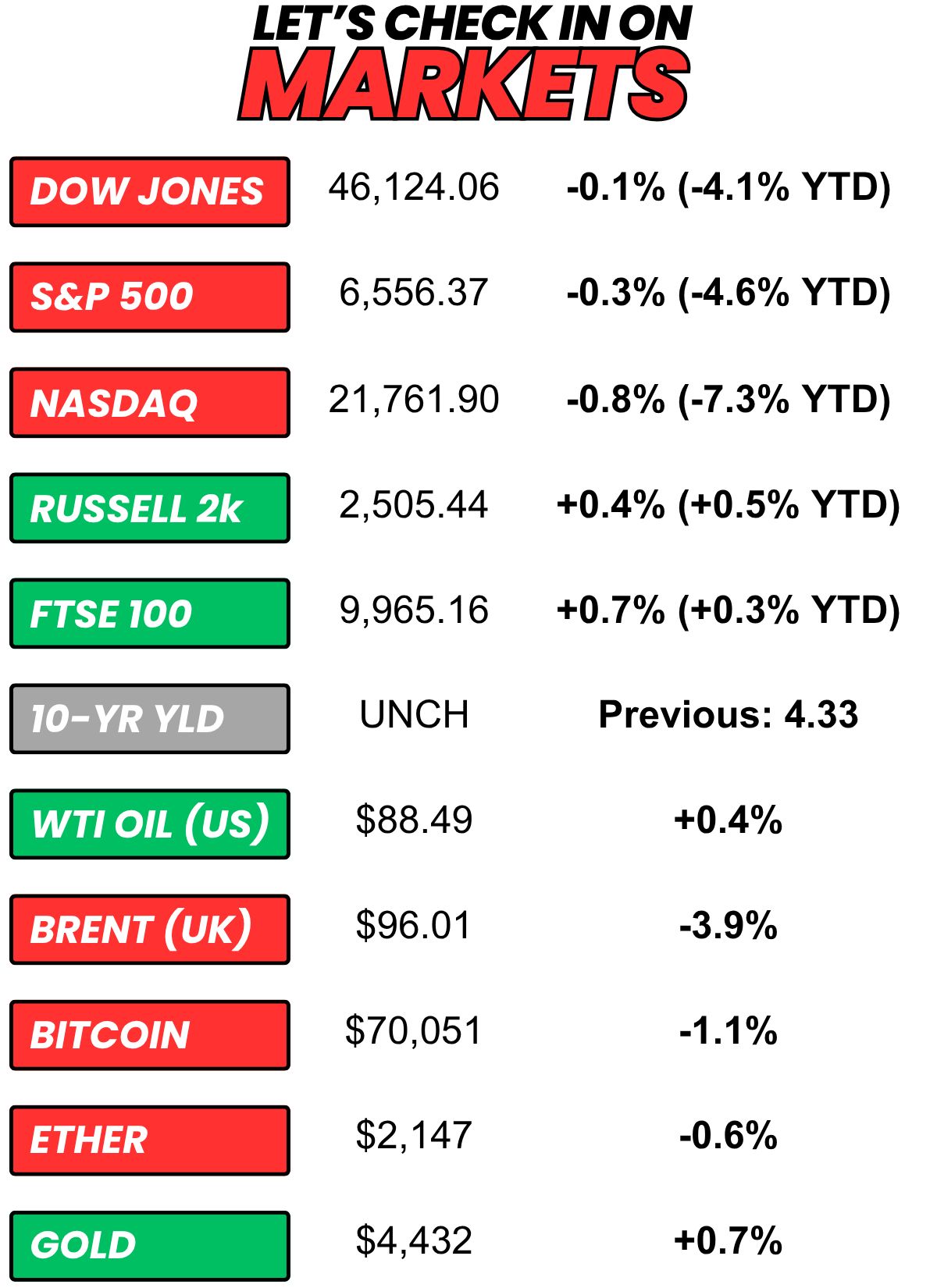 + US stocks “declined on Tuesday as the price of oil rose, with fighting between the US-Israel alliance and Iran raging unabated, even as President Donald Trump took an optimistic tone on the state of negotiations with Iran.” (Bloomberg)