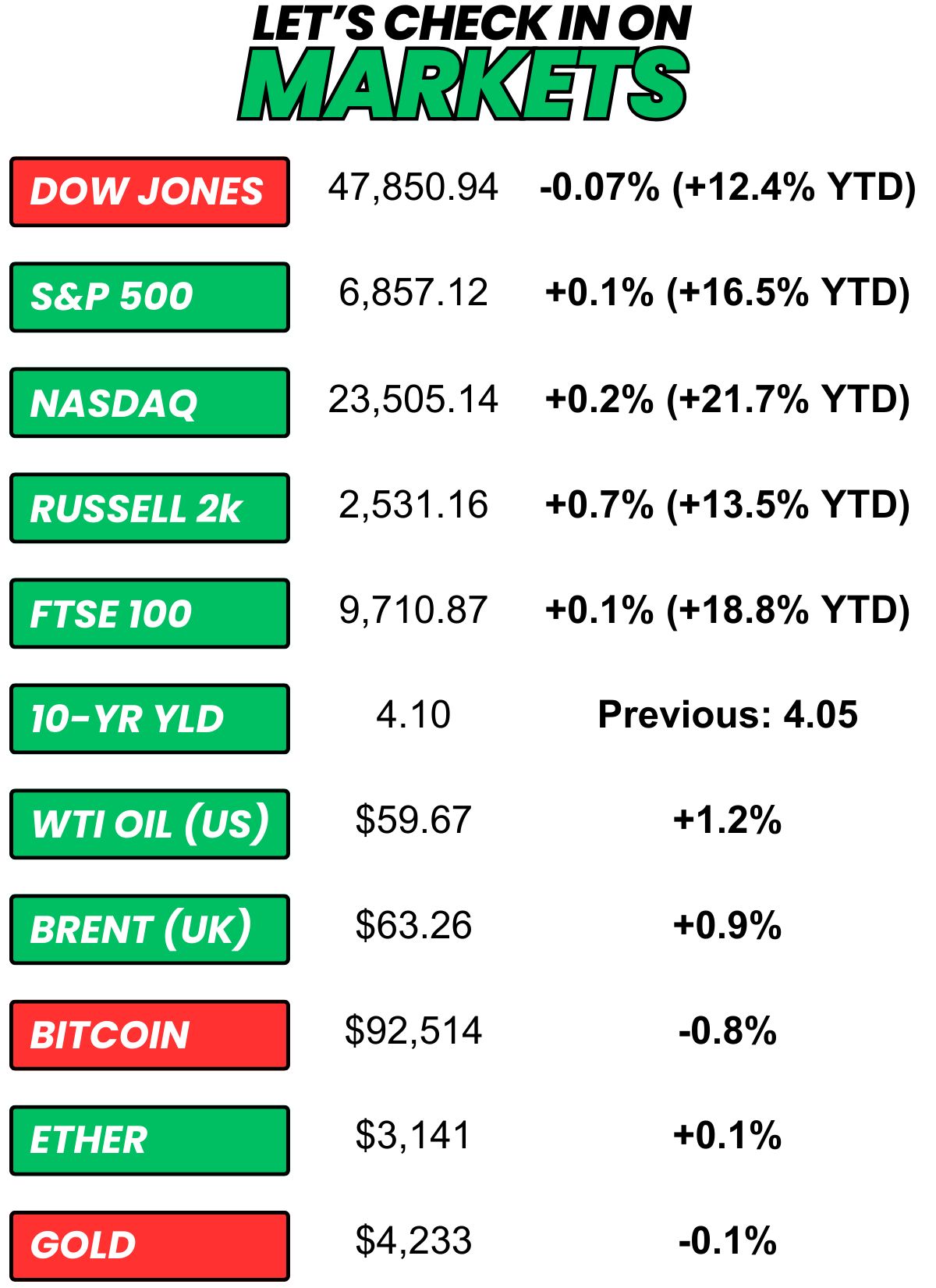 + US stocks “closed mixed on Thursday as Wall Street digested fresh jobs data, with traders increasingly baking in expectations that the Federal Reserve will deliver a December rate cut.” (Yahoo! Finance)